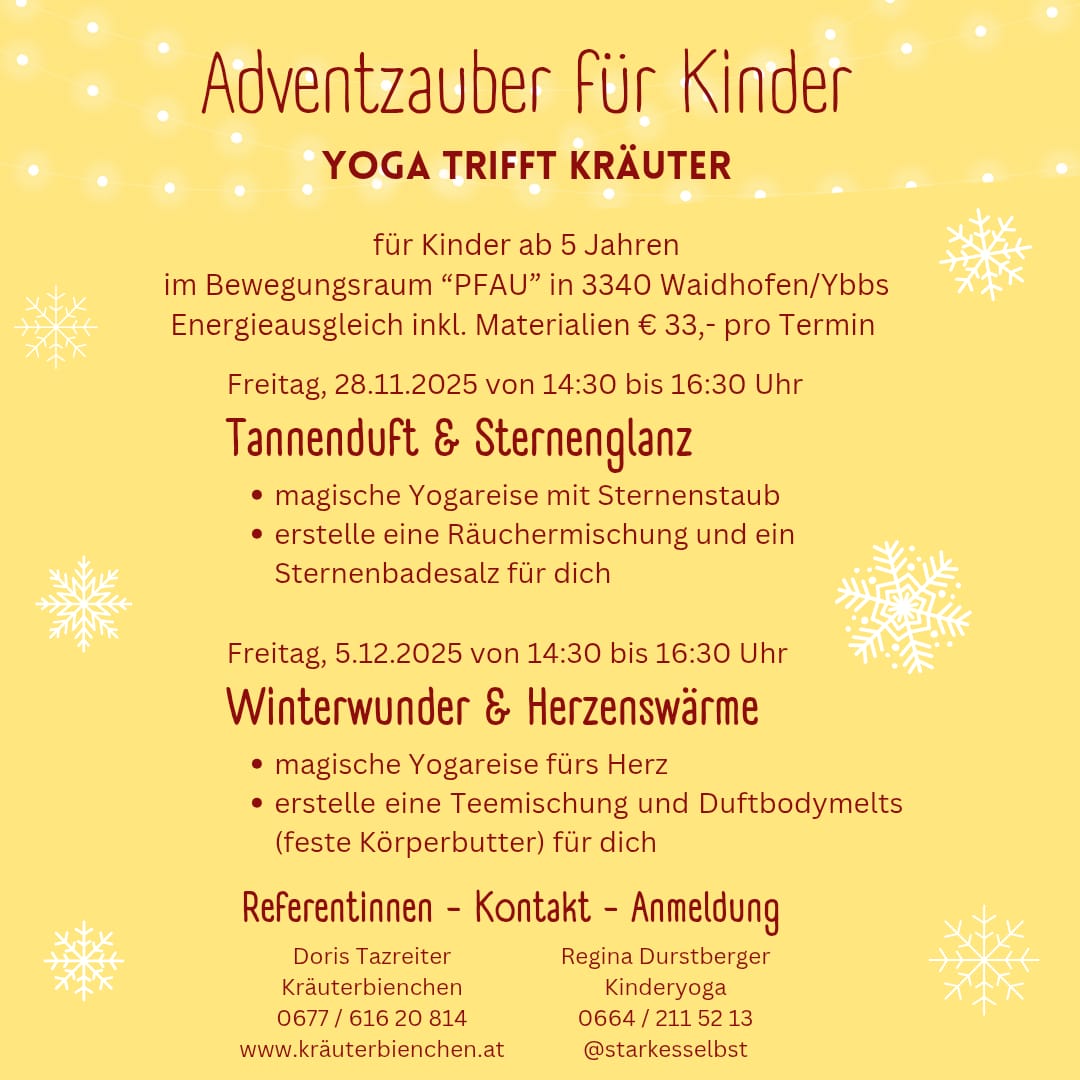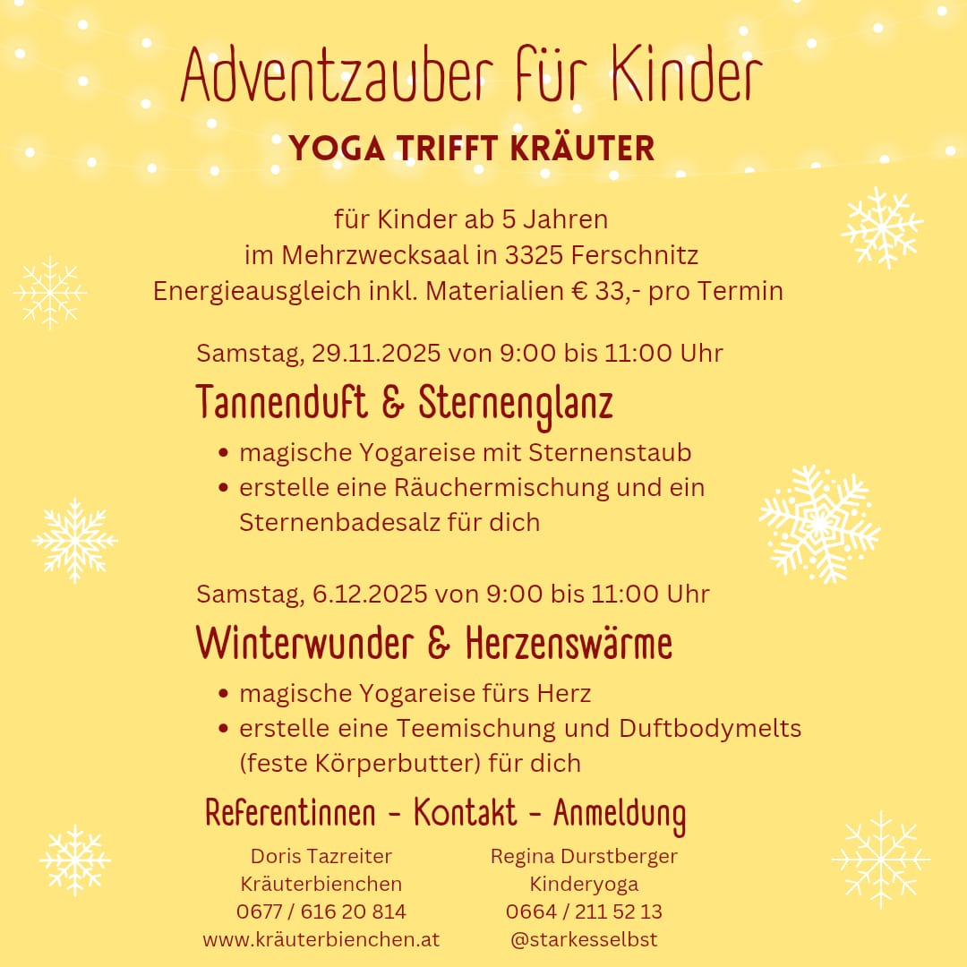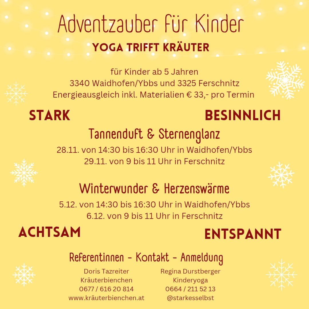 Besinnlich, achtsam, stark und entspannt geht es durch den Advent! Wir haben da für eure Kids ein ganz bezauberndes Adventprogramm zusammengestellt. Wir veranstalten jeweils an 2 Terminen ab Ende November in Ferschnitz und Waidhofen/Ybbs ein buntes Programm rund um die Themen „Tannenduft & Sternenglanz“ und „Winterwunder & Herzenswärme“. Zu den jeweiligen Terminen erstellen wir jeweils 2 Produkte oder gestalten etwas passendes zum Thema und zusätzlich gibt es das passende Kinderyogaprogramm von Regina Durstberger.