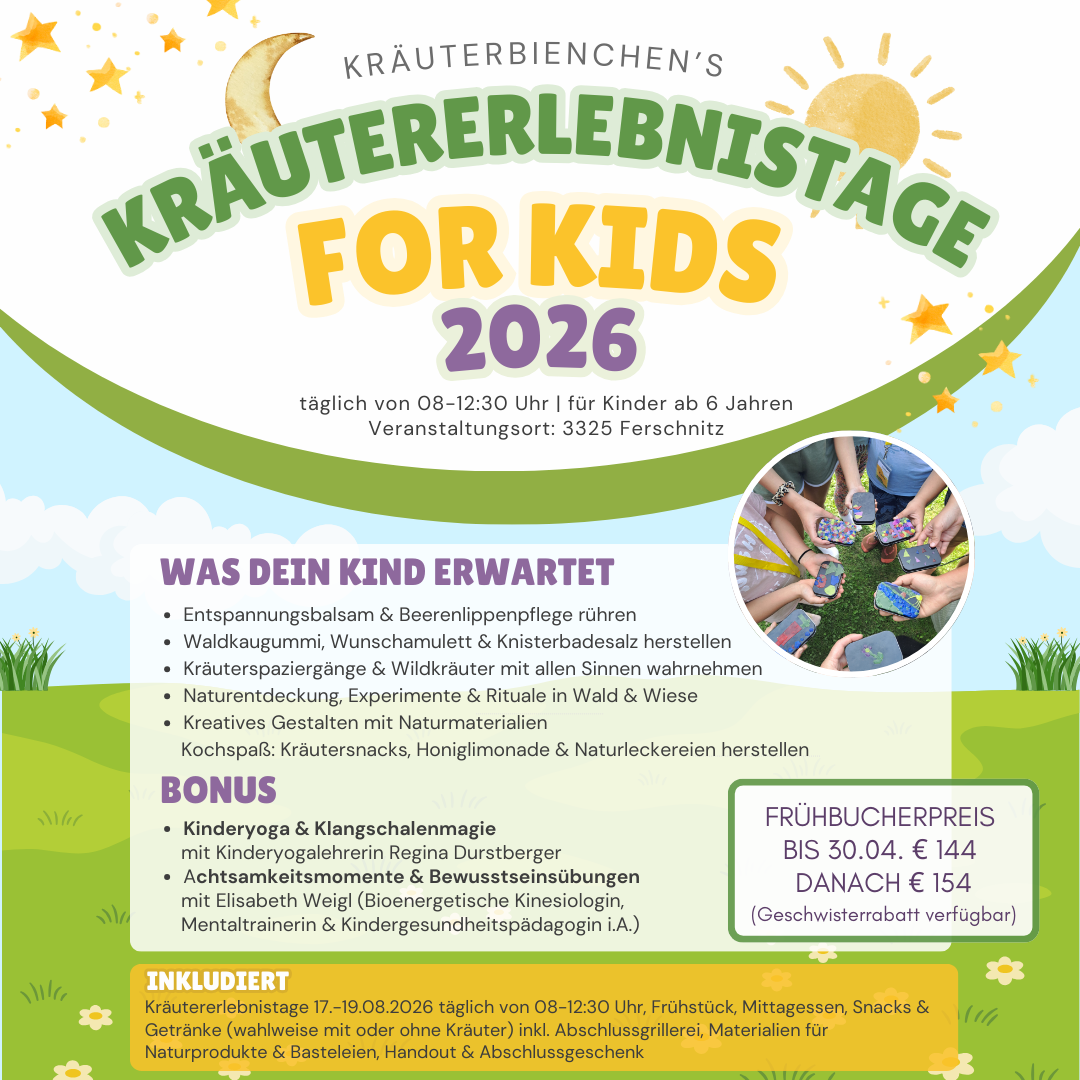 Von 17. bis 19. August 2026 erleben die Kinder drei abwechslungsreiche Vormittage in und mit der Natur. Gemeinsam entdecken wir heimische Kräuter, lernen ihre Besonderheiten kennen und verarbeiten sie zu kleinen Naturschätzen und leckeren Köstlichkeiten.