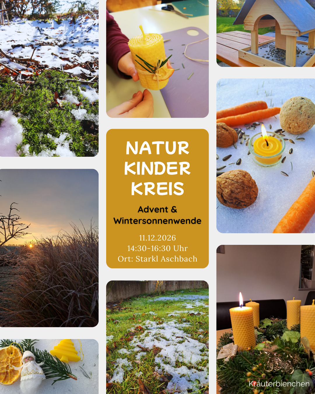 11.12.2026 – Advent & Wintersonnenwende: Wenn das Licht zurückkehrt … in der dunkelsten Zeit des Jahres und im Advent bereiten wir uns gemeinsam auf das Weihnachtsfest vor. Die Kinder lernen das Fest der Wintersonnenwende kennen, entdecken Gewürze beim Dufträtsel, drehen ihre eigene Bienenwachskerze und backen Vogelfuttermuffins für eine kleine Waldweihnacht. Ein warmes, ruhiges Naturerlebnis rund um Licht, Düfte und das Miteinander in der Adventszeit.