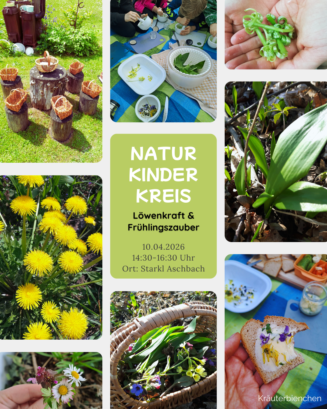 10.04.2026 – Löwenkraft & Frühlingszauber: Die Kinder entdecken Löwenzahn, Bärlauch und das Erwachen der Natur! Spielerisch lernen sie Kräuter kennen, üben achtsames Sammeln und erleben die Natur mit allen Sinnen. Bei einem Kräuterspaziergang, Löwenzahn-Basteleien und der Herstellung einer eigenen Frühlingsschüttelbutter können sich die Kinder ausprobieren und die Natur bewusst mit allen Sinnen wahrnehmen.