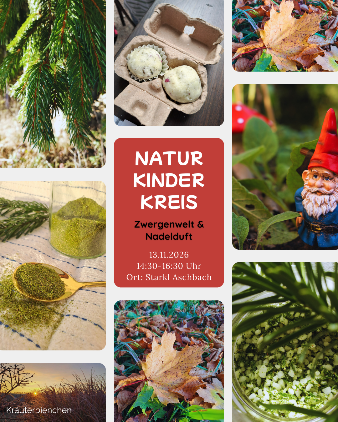 13.11.2026 – Zwergenwelt & Nadelduft: Zwischen Moos, Zapfen und Nadelduft entdecken wir die Welt der Zwerge! Die Kinder erfahren spielerisch, warum sich die Natur im Winter verändert und warum manche Bäume auch in der kalten Zeit grün bleiben. Gemeinsam basteln wir einen kleinen Zwergengarten, stellen Badekugeln mit Nadelduft her und lauschen einer Zwergengeschichte – ein zauberhaftes Naturerlebnis voller Düfte, Fantasie und winterlicher Stimmung.